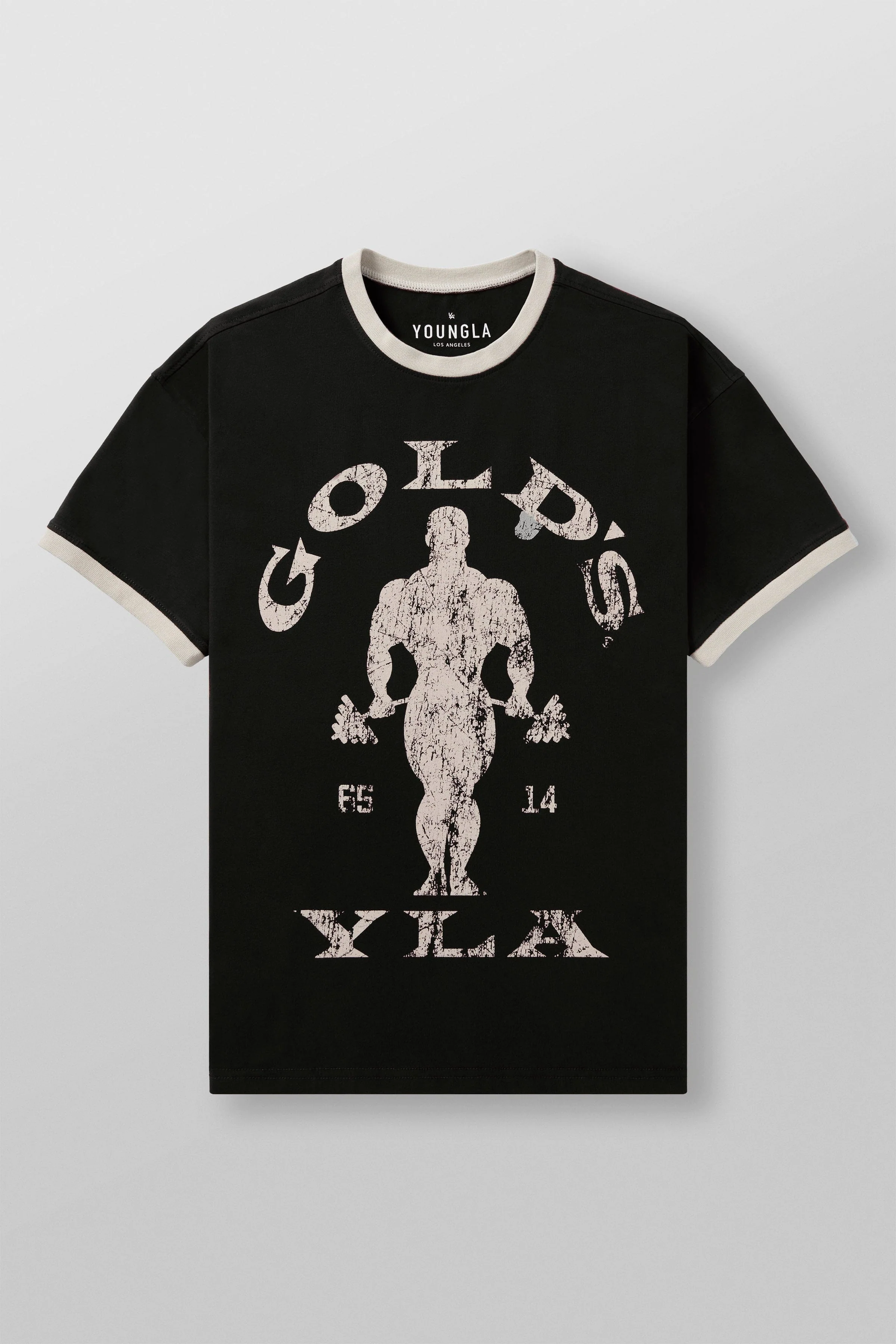 DISEÑO: Esta camiseta de gimnasio de YoungLA x Gold ofrece una combinación de estilo clásico y comodidad moderna. Diseñado con gráficos desgastados de inspiración vintage en la parte delantera, muestra el icónico emblema Gold's Gym. También cuenta con un diseño de timbre retro con cuello y dobladillos de manga en contraste.